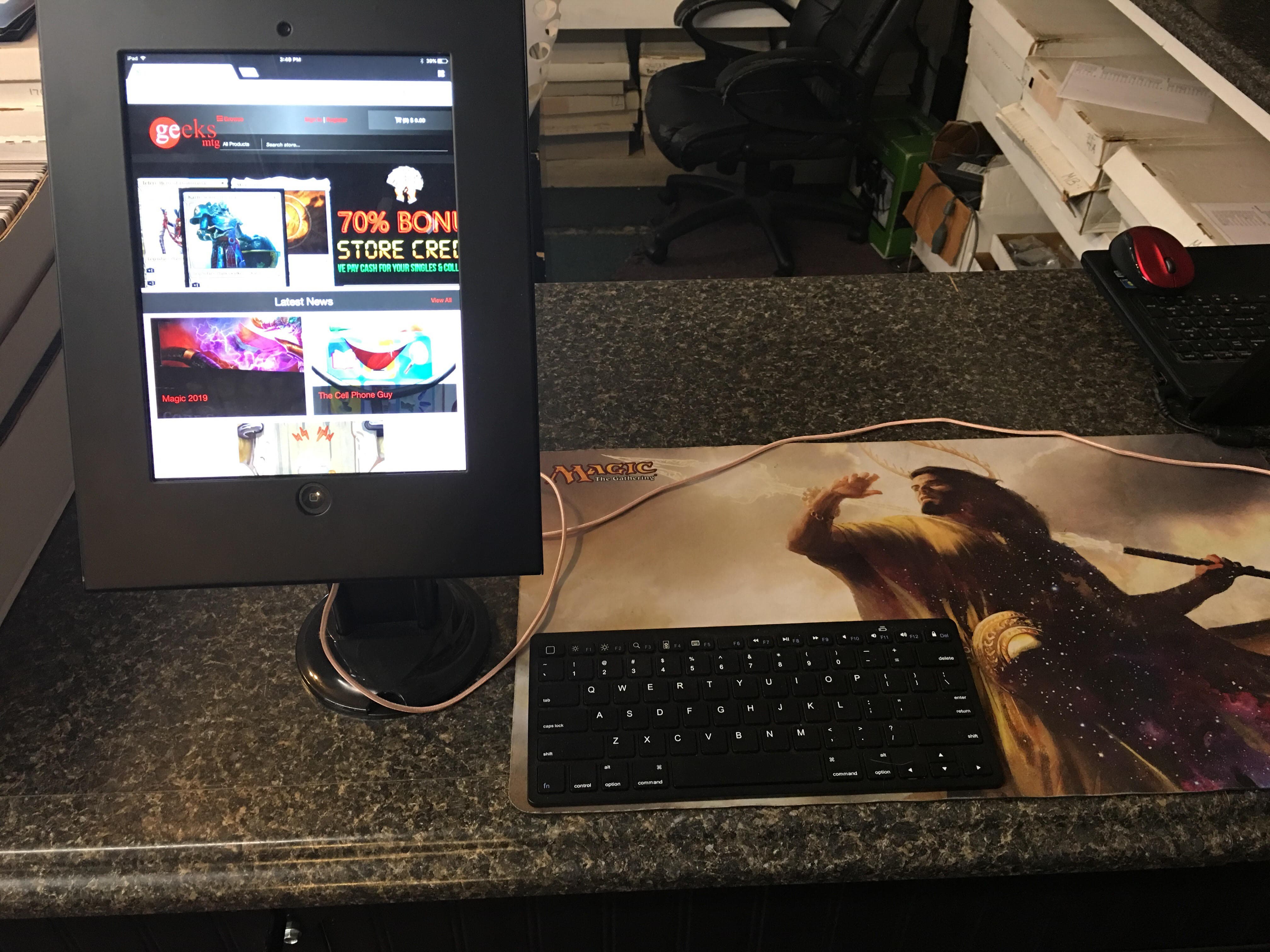 If anybody wants to see the kiosk thing that I’ve built up, which is really awesome, actually, I just bought a full-sized iPad. I put it on a metal enclosure, bolted it down to the counter and got a permanent power to it and got a Bluetooth keyboard, you know, you can actually access it sideways, up. With the IPAD I actually lock it into the Google Chrome for Crystal Commerce. It’s a great little kiosk. I think I built it for less than 300 bucks.