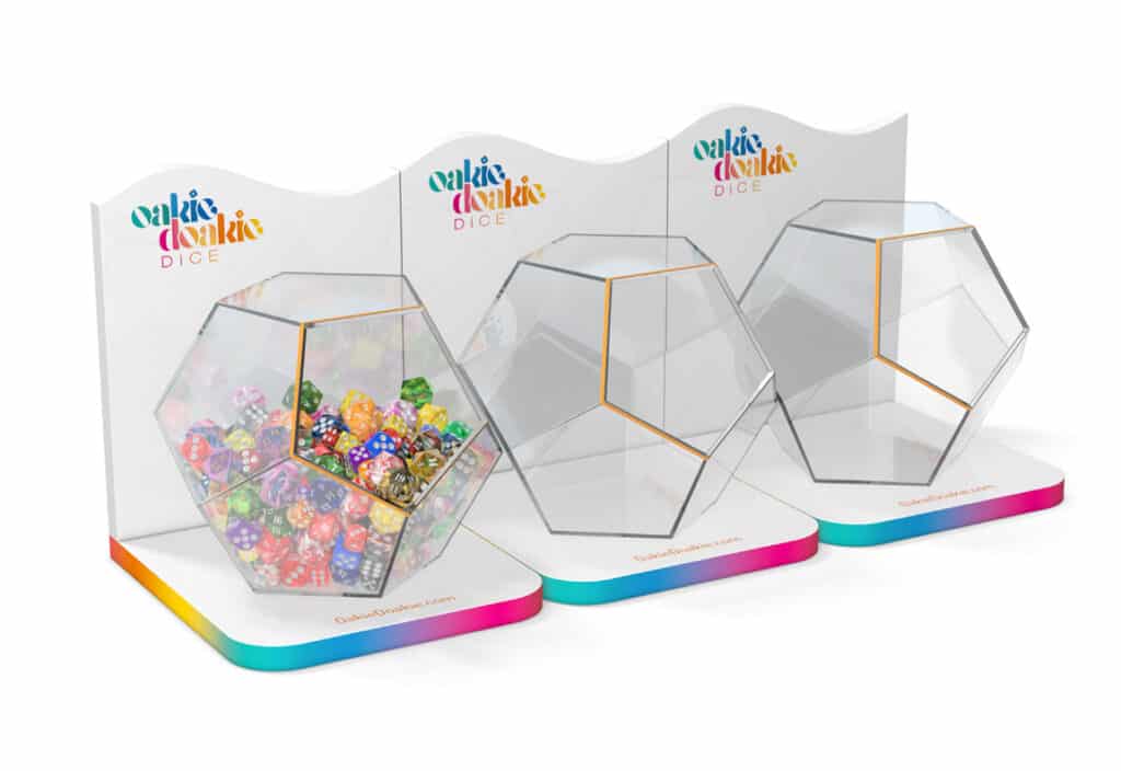 Oakie Doakie Dice offers beautiful, rotating displays which make it super easy to present their wide variety of dice, offering an effective way for you to optimize the consumer experience for your customers. Choose the countertop display or the tall floor display, whichever best fits your space and stock needs.
